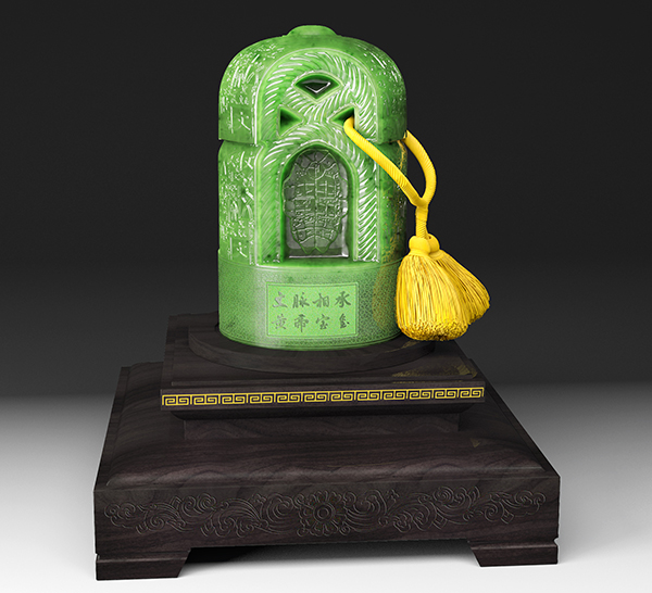 “黄帝文玺”采选优质和田碧玉,取其精华圆芯整体雕凿,上面刻有“文脉相承、黄帝宝玺”文字,寓意:“玺说文脉历史传承,淬炼中华民族精神标识”。三面深雕镂凹玺钮整玉圆芯表现结绳到造字的跃迁,体现中华文化源远流长。几近镂空的深凹雕凿工艺体现绳纹浮雕的“文”字,并以浮雕柔圆工艺表现—甲骨文,体现隐隐约约的神秘隐藏之感。圆润浮雕玺钮侧边整体圆雕,微浮工艺雕刻玺三个侧面,玺钮三个侧边以包含甲骨文、金文、大篆、小篆、隶书、楷书、宋体、行书、草书等各种行文字体,体现中华文明的五千年荣耀,与一脉传承,显耀着文化同根,民族团结、国家富强的中国形象。整尊玉玺雕凿一气呵成,碧玉色温泽润,晶莹若透,如琉璃般滑润光洁,典雅高贵。