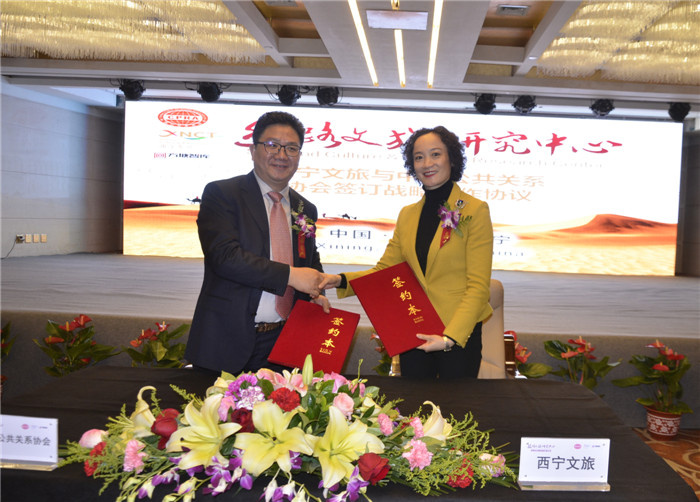 中国公共关系协会常务副会长兼秘书长王大平(左)与西宁文化旅游发展投资有限公司党委书记、董事长郭红萍(右)签署战略合作协议