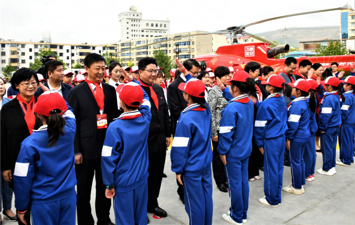 参加活动的延安小学生代表给领导和嘉宾佩带红领巾