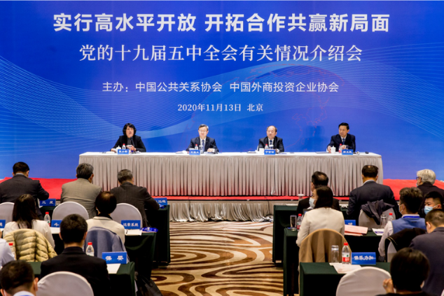 11月13日下午,“实行高水平对外开放,开拓合作共赢新局面——党的十九届五中全会有关情况介绍会”在京举行,在华外商投资企业、国际公关公司代表180余人参加。