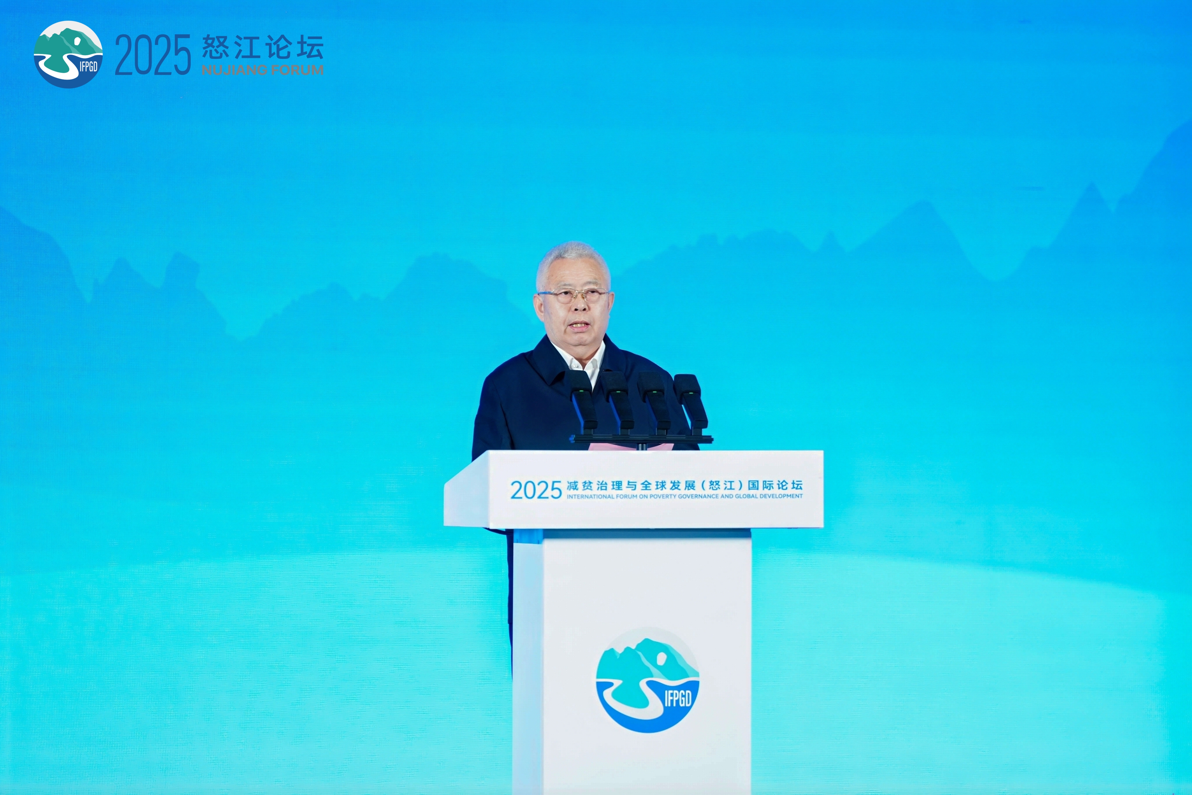 中国乡村发展志愿服务促进会会长、原国务院扶贫办党组书记、主任刘永富在2025减贫治理与全球发展(怒江)国际论坛演讲。