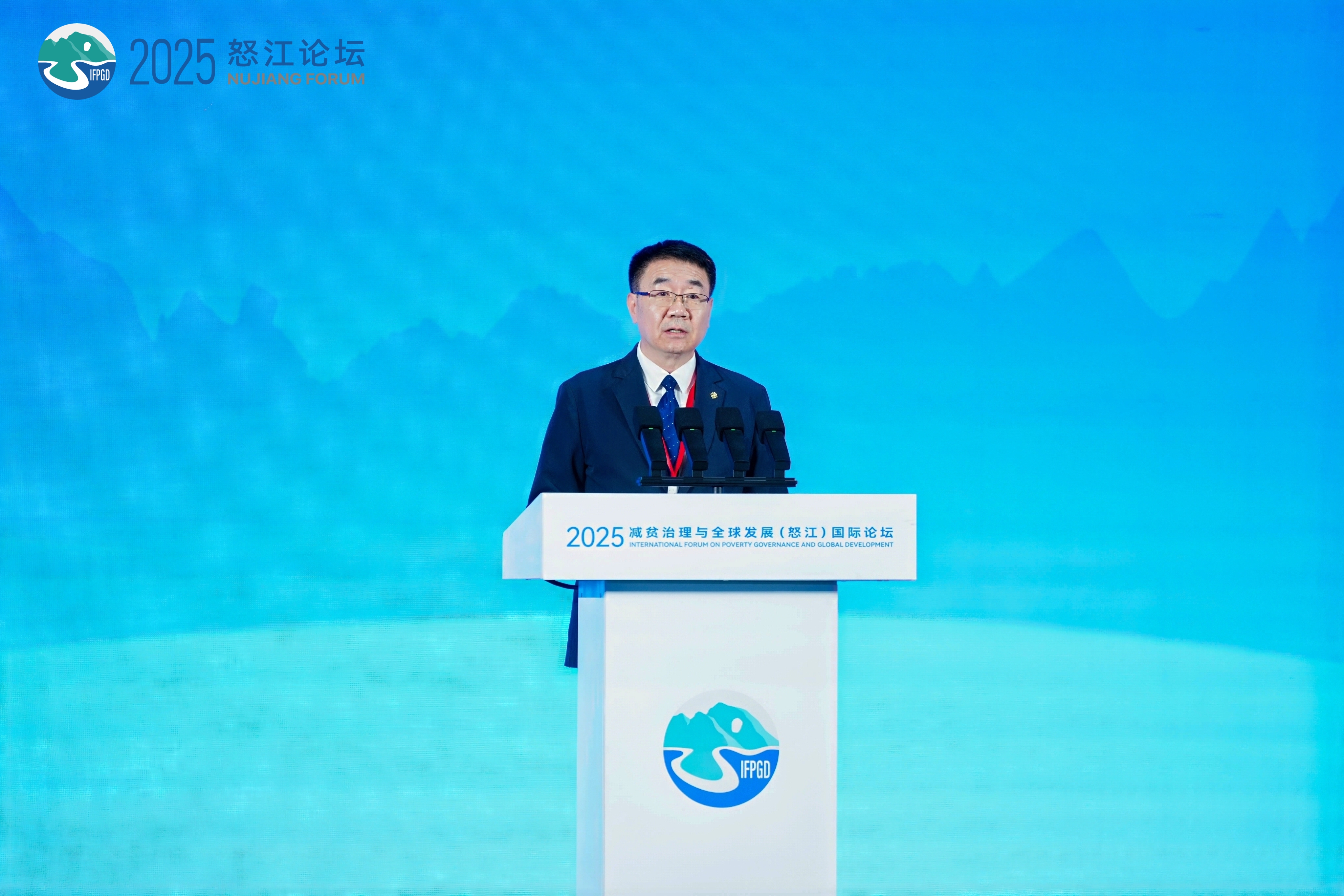 中国交通建设集团有限公司党委副书记、董事刘翔在2025减贫治理与全球发展(怒江)国际论坛演讲。